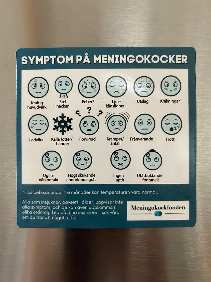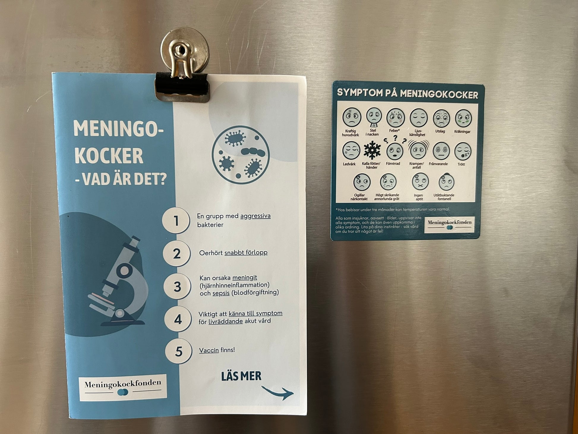 Kostnadsfritt informationsmaterial om meningokocker i form av kylskåps magnet med symptomen